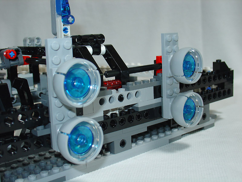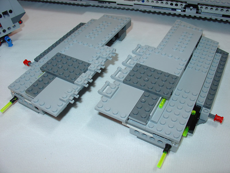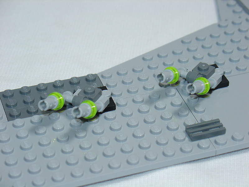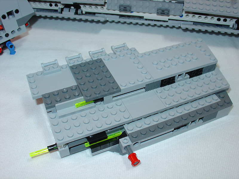以淺灰色為底搭配一些深灰色以及螢光綠的積木,讓整台帝國戰艦