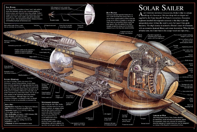 跟其它吉奧諾西斯飛船一樣,太陽帆船使用複雜的牽引/反重力窄束陣列作為進攻時的抓捕工具和飛行時的操縱輔助工具,這給飛船提供了無以倫比的機動性。杜庫伯爵使用這種星際帆船離開吉奧諾西斯星球,從克隆人戰爭的第一場戰鬥中逃脫。他來到科洛桑的廢棄區,會見他的黑暗面師父達斯·西迪厄斯。