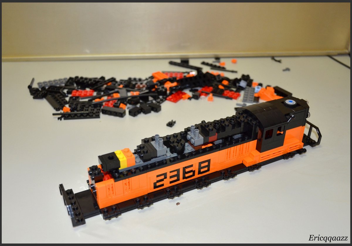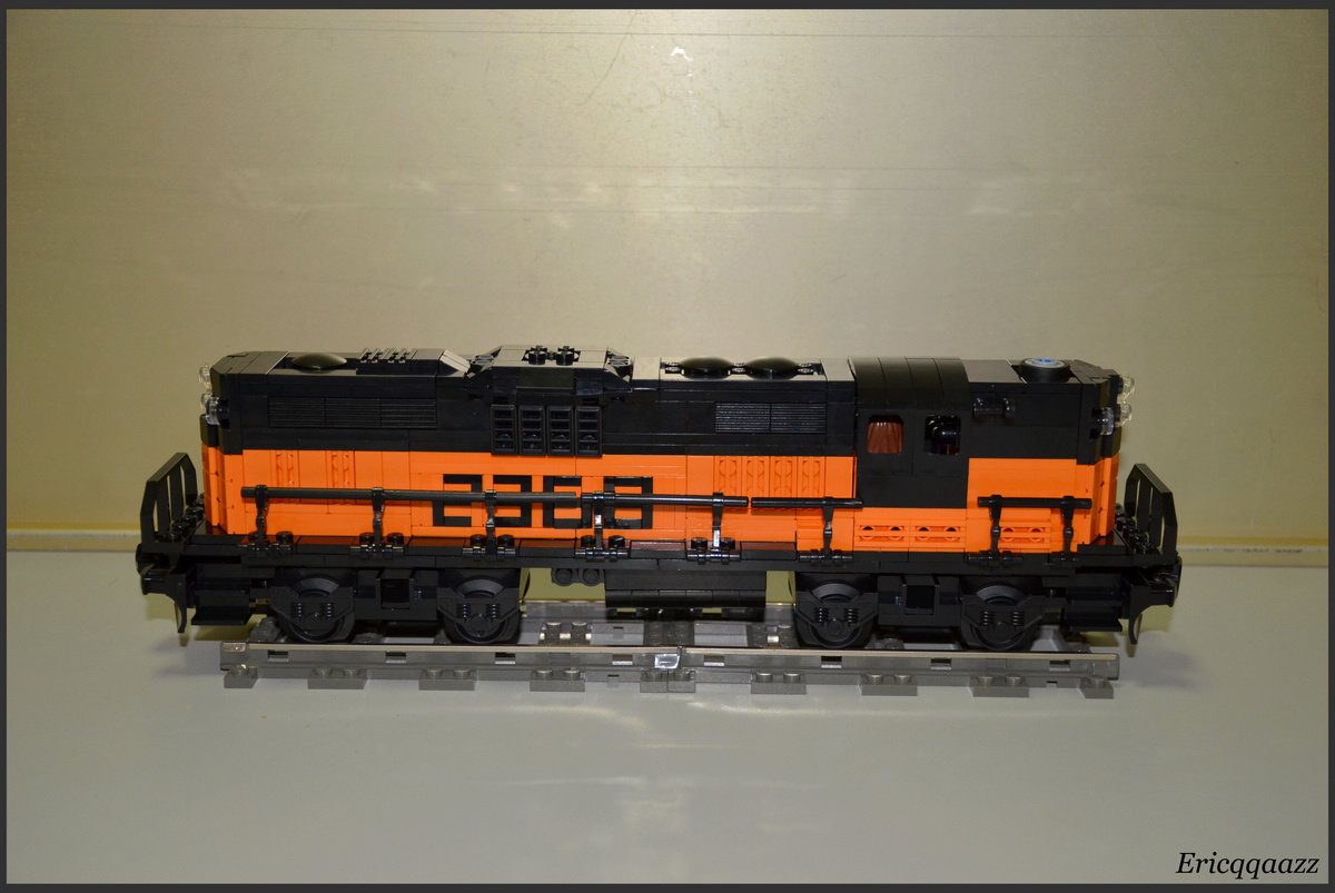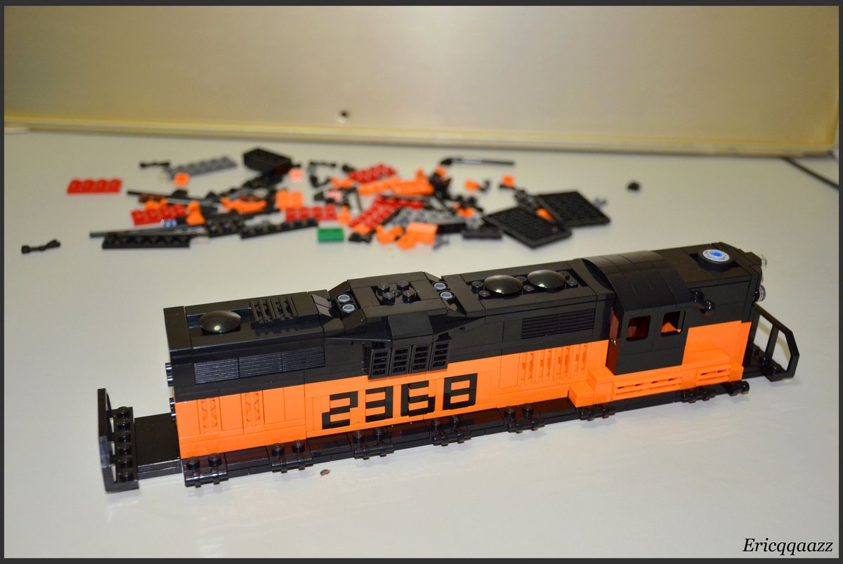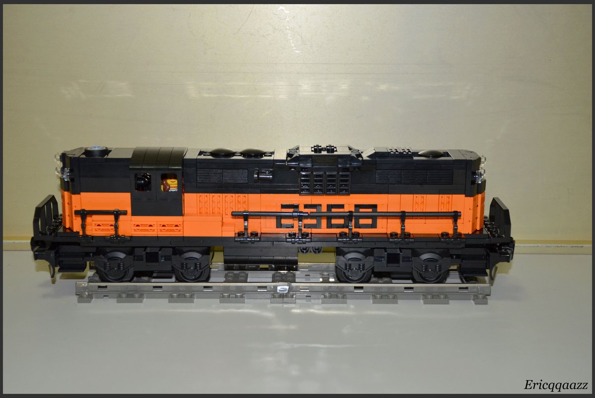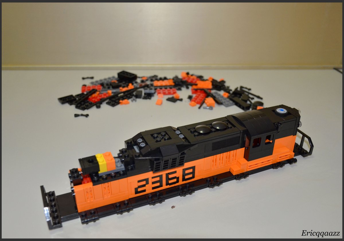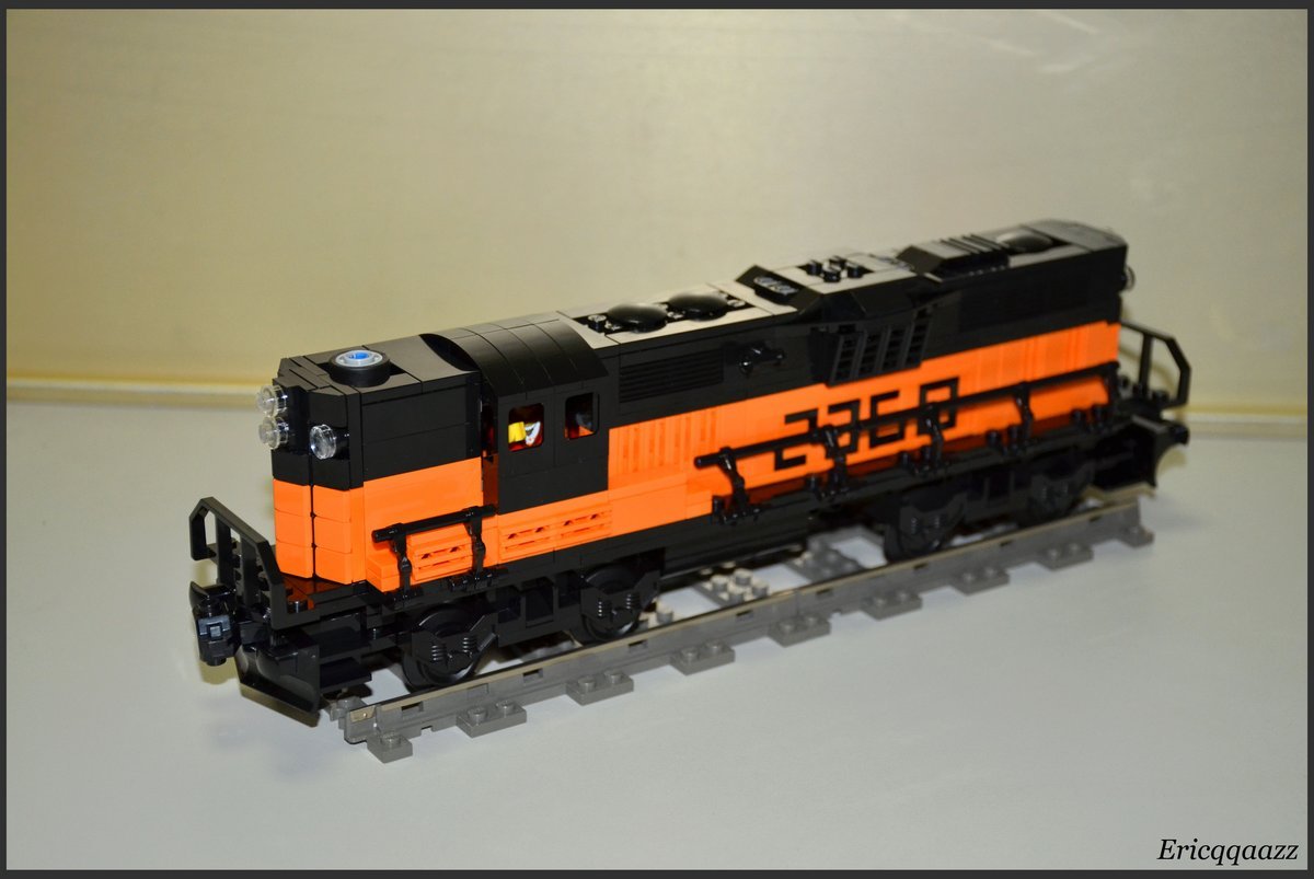 這次拼的是EMD GP9的火車頭. 這是一款四軸的柴油火車頭, 建造於上世紀50年代的美國. 該系列有2個版本, 分別是有駕駛艙版和無駕駛艙版. 無駕駛艙的純粹是為了重聯使用, 以提高輸出動力. 而我這次MOC的是有駕駛艙版, 並且是橙黑塗裝的.(橙色控, 無解了) 車身代碼是2368.
