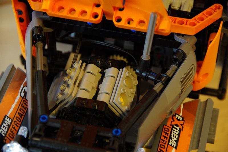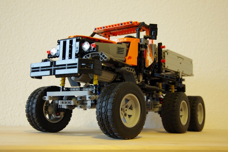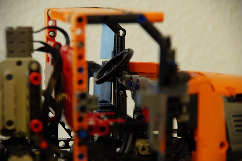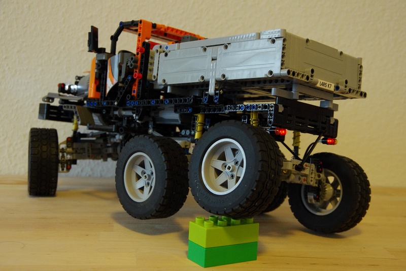B. 使用線性螺旋杆驅動轉向:傳統的做法是使用齒輪齒條結構驅動轉向,在沒有懸挂或者采用獨立懸挂的情況下齒輪齒條結構是可以勝任的,但在擺式懸挂中用齒輪齒條結構驅動轉向多少讓人不放心。包括樂高官方套裝8110在內,這種設計在擺式懸挂中的不可靠性是明顯的。而換裝線性螺旋杆後可靠性大大提高,而且在摩擦力較大的表面轉向同樣遊刃有余。重要的是要保證線性螺旋杆兩端均能自由轉動,而且可以很方便地通過調整力臂長短控制轉角大小,非常適合用于實現多軸轉向的題材。