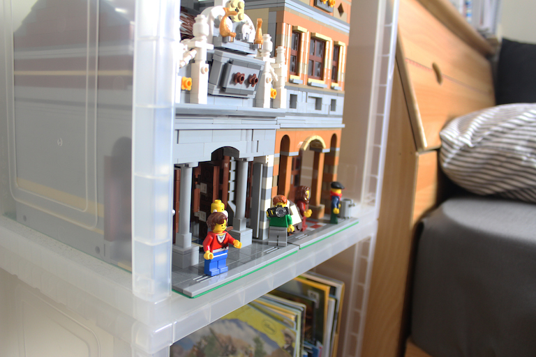 目前透明櫃上面我擺放街景 一個櫃子的大小差不多等於一個樂高綠色底板寬度 32格數 前面還能放車輛路人