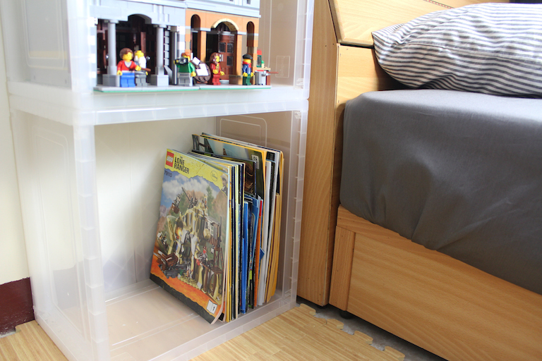 或是像我下圖這樣立起來堆放 放作品 或是放樂高說明書 一箱一箱之間他有東西可以固定 不會倒了或是垮了
