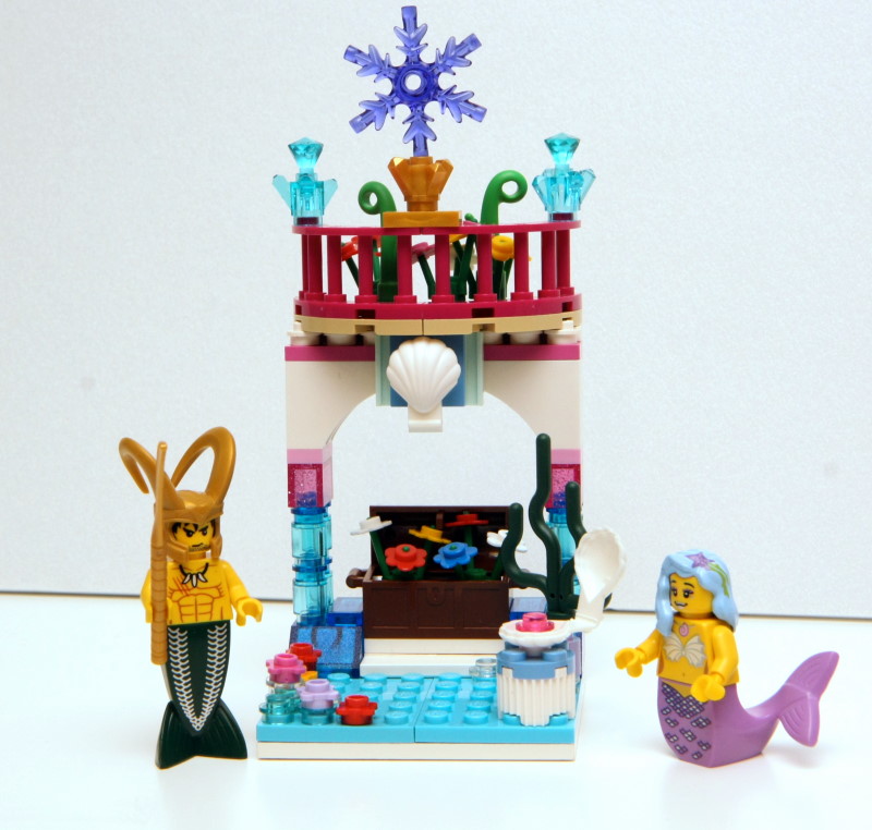 人偶剛好可以收納在裡面,要把玩時再拿出來免得弄髒。當然裡面也可以放些項鍊、戒指之類的小飾品。 作品三號:「我會永遠陪伴著你/妳。」 雖然樂高有出小美人魚系列,但我們始終都比較喜歡「肥版」美人魚。延用樂高迪士尼公主系列的繽紛色彩,是這個作品的設計重點,所以可能會有人覺得太「花」了吧!哈哈!不過,場景主題確實是神獸的「氣能量石」+冰雪奇緣的雪花,能讓海底也能開滿美麗的鮮花,所以藏寶箱裡放的不是珠寶而是鮮花。