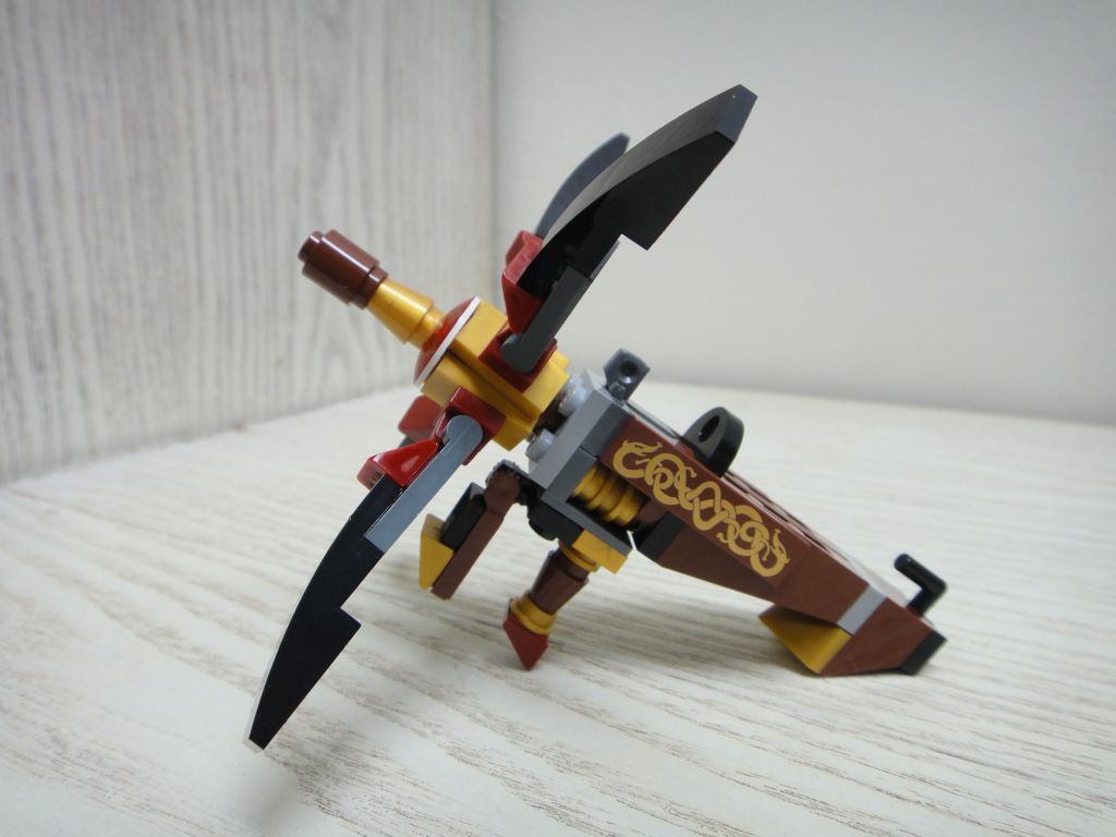左右不對稱設計,兩臂裝有飛鏢發射器,本身無裝配十字銀弓